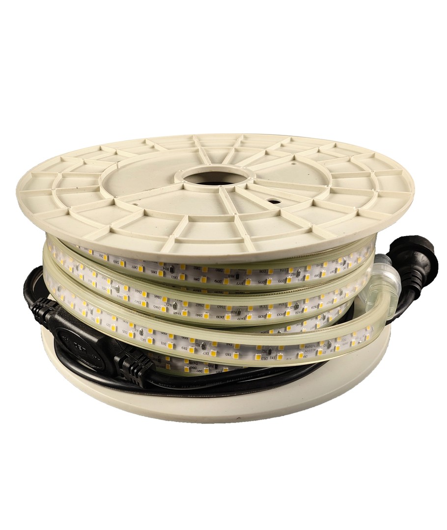 LED strippen tilsluttes direkte til en 230V forsyning, hvilket gør installationen nem og ukompliceret. Med en sikret IP67 klassifikation er produktet vandtæt, hvilket gør det ideelt til både indendørs og udendørs brug, dog bør det ikke placeres under vand i længere tid.