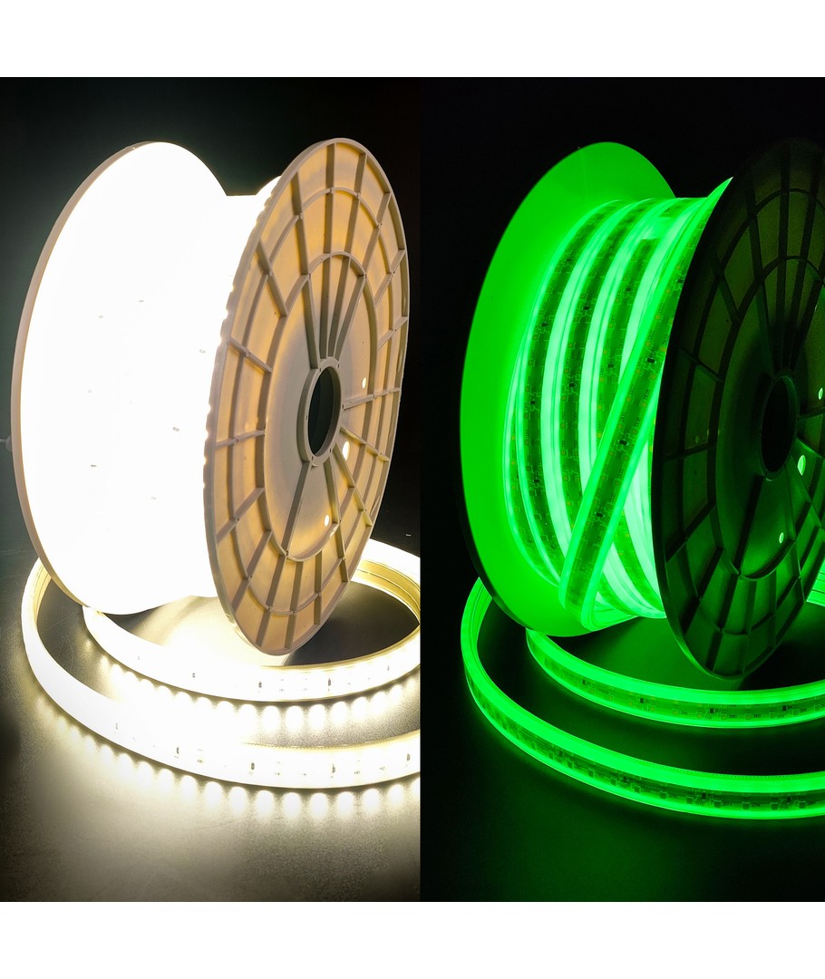 Få både kraftigt arbejdslys og nødlys i ét produkt! Denne 15 meter lange LED strip leverer et stærkt lys, når den er tændt, og lyser selvlysende grønt, når den er slukket – perfekt til byggepladser, garager og udendørsarealer.