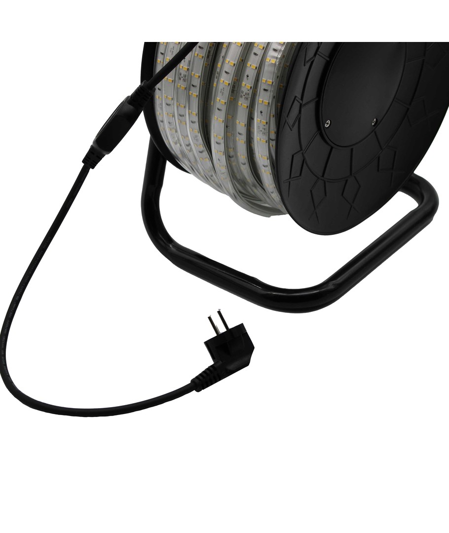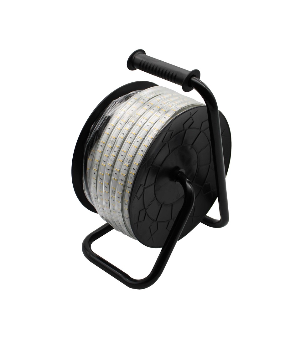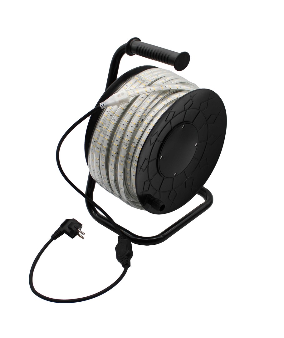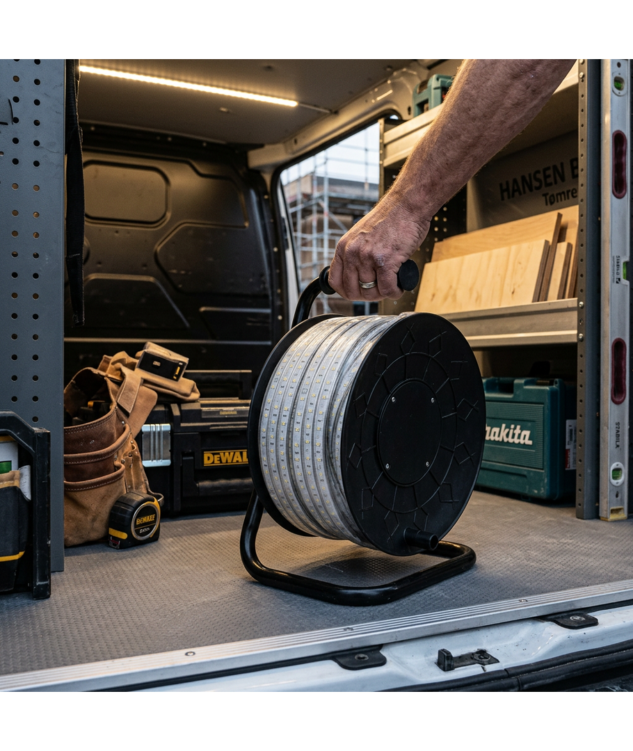 Driftssikker LED-strip på praktisk tromle, der leverer ensartet og kraftigt lys til både inde- og udendørs brug. Perfekt til byggepladser, værksteder og andre områder med behov for midlertidig belysning.