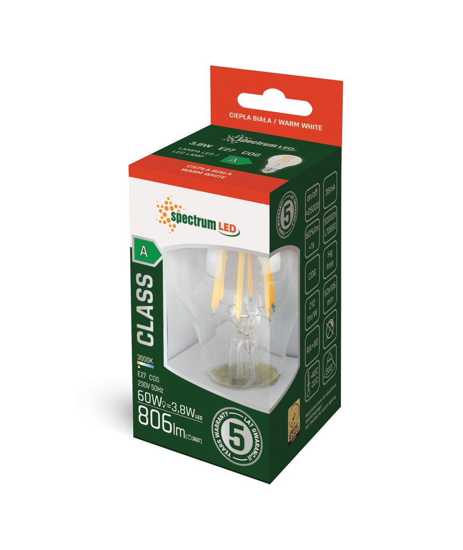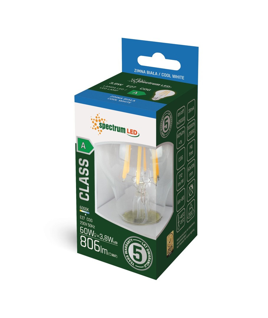 Opgrader dit belysningsmiljø med denne innovative Spectrum 3,8W LED pære, der kombinerer energieffektivitet med et stilfuldt design. Denne pære er den ideelle erstatning for traditionelle glødepærer på 60W, hvilket gør den til et miljøvenligt og økonomisk valg.