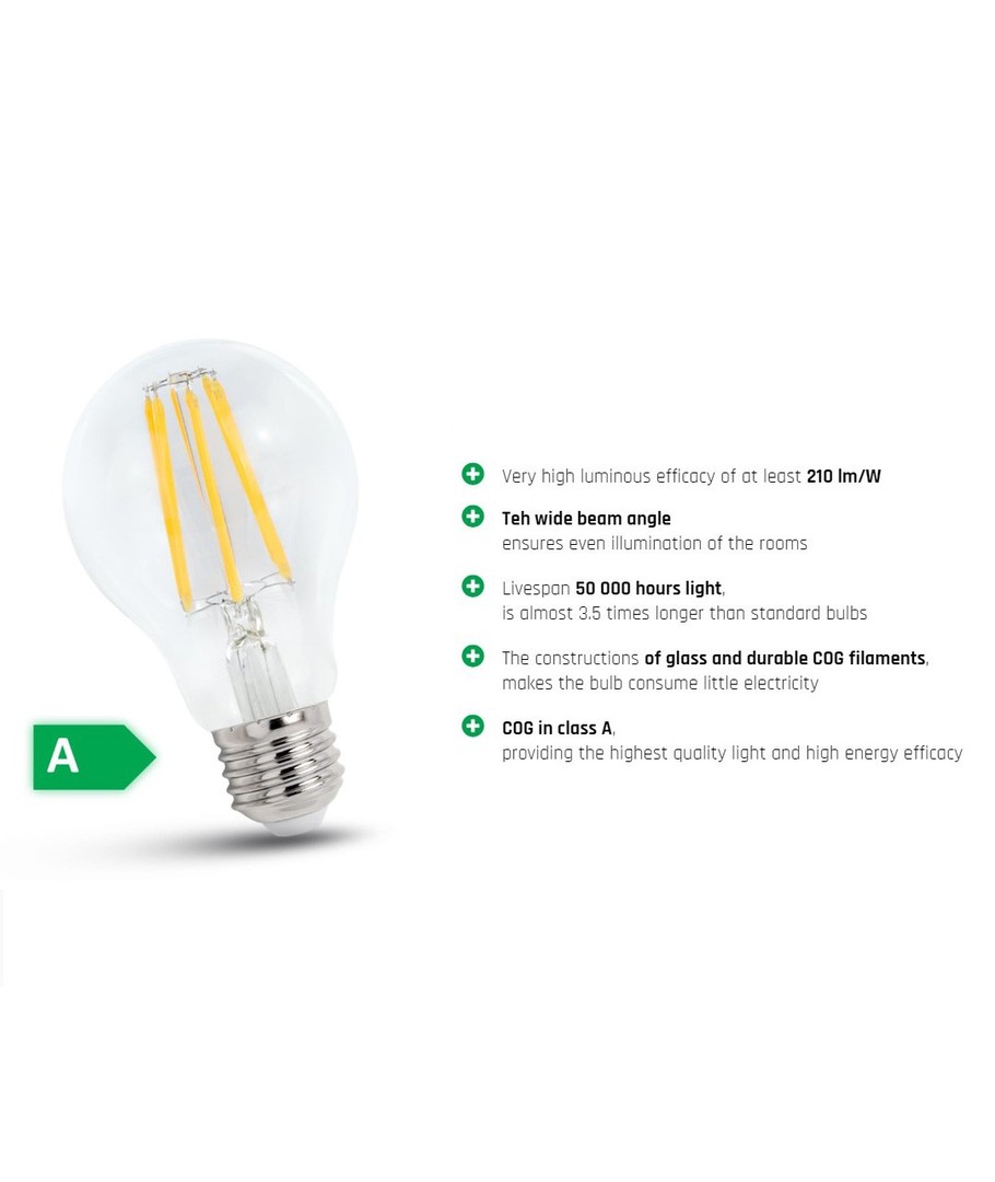 Pæren har en kompakt størrelse med dimensionerne 106 x Ø60 mm, hvilket gør den let at installere i de fleste lamper og armaturer. Det klare glasdesign med kultrådseffekt tilføjer et klassisk og elegant udseende, der passer til både moderne og traditionelle interiørs.