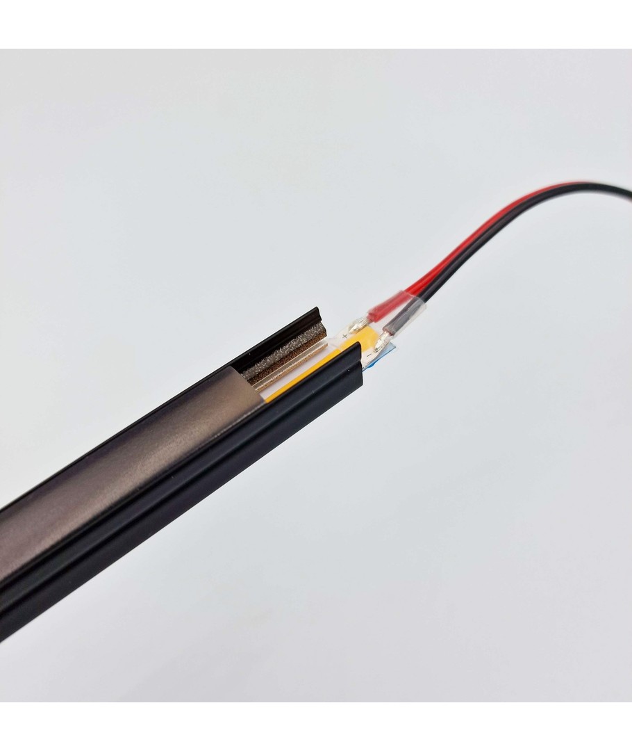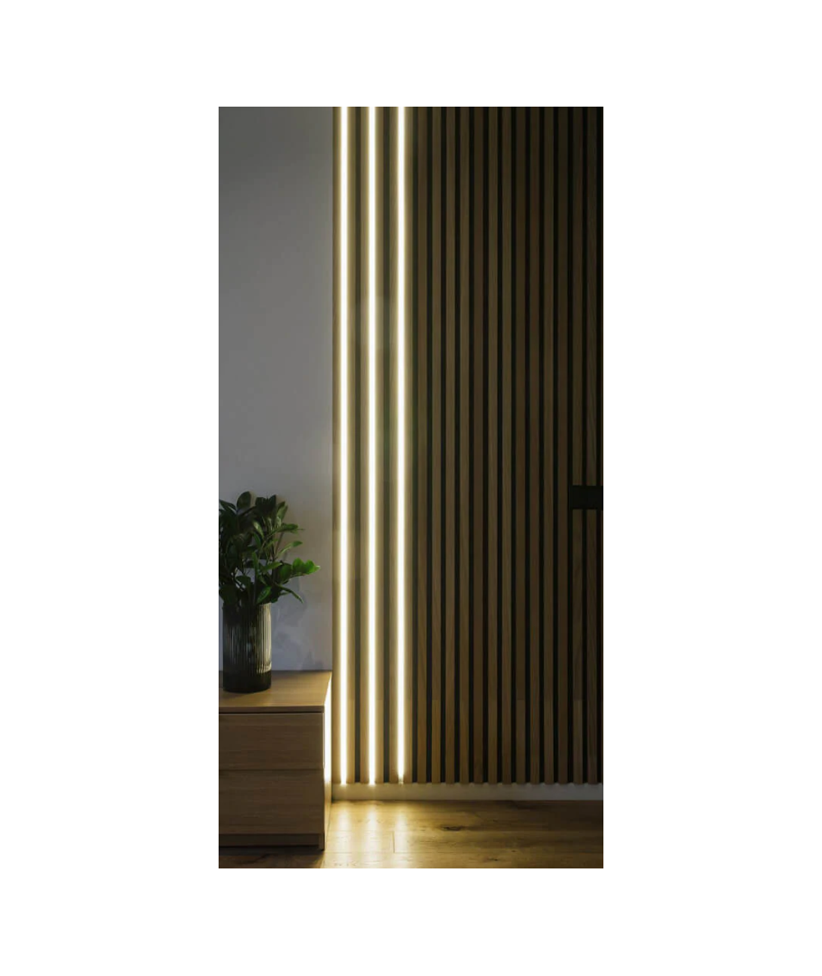 Få mest muligt ud af dine akustikpaneler med dette profilsæt. Denne løsning kombinerer en sort aluprofil med en varm hvid COB LED strip, hvilket giver en elegant og diskret belysning uden synlige dioder. Perfekt til at skabe et smuk og æstetisk lys mellem lamellerne i dine akustikpaneler.