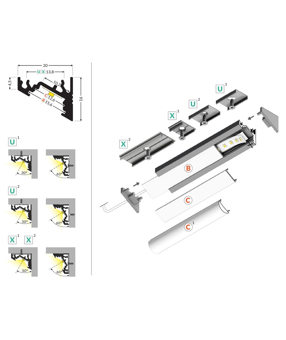 2m aluprofil CORNER10 BC/UX er en alsidig LED skinne designet til hjørnemontage.