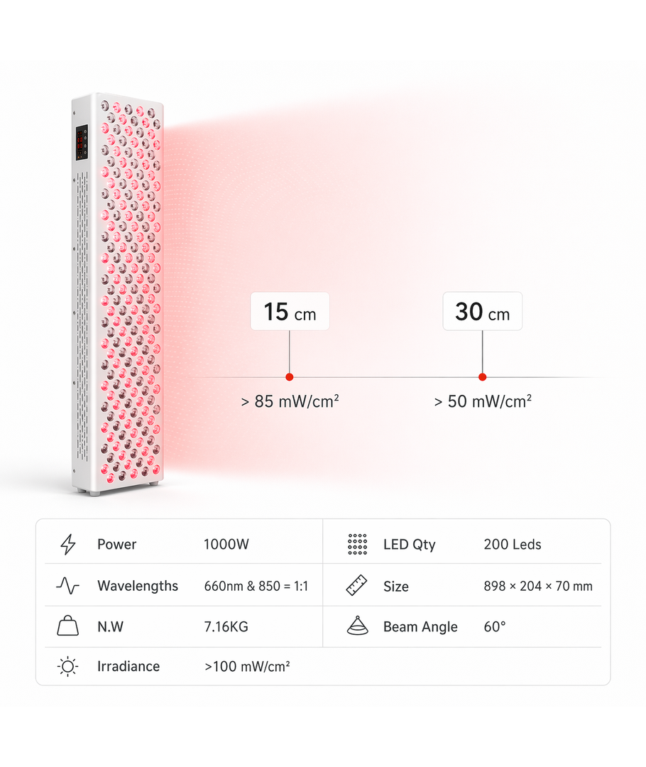 Dette kraftfulde lyspanel er skabt til at integrere professionel lysterapi i din daglige selvpleje. Med en højde på 90 cm får du en omfattende dækning, der gør det nemt at behandle hele kroppen effektivt i vante omgivelser.