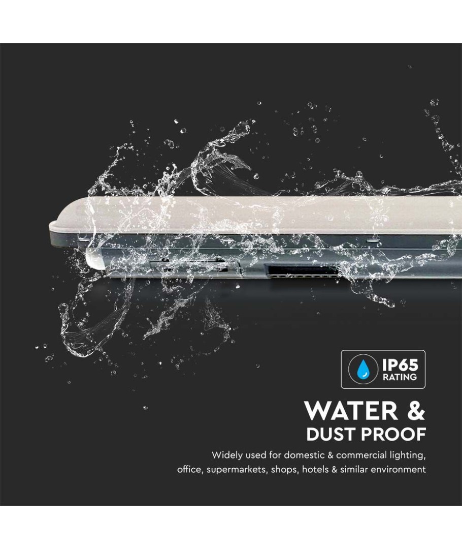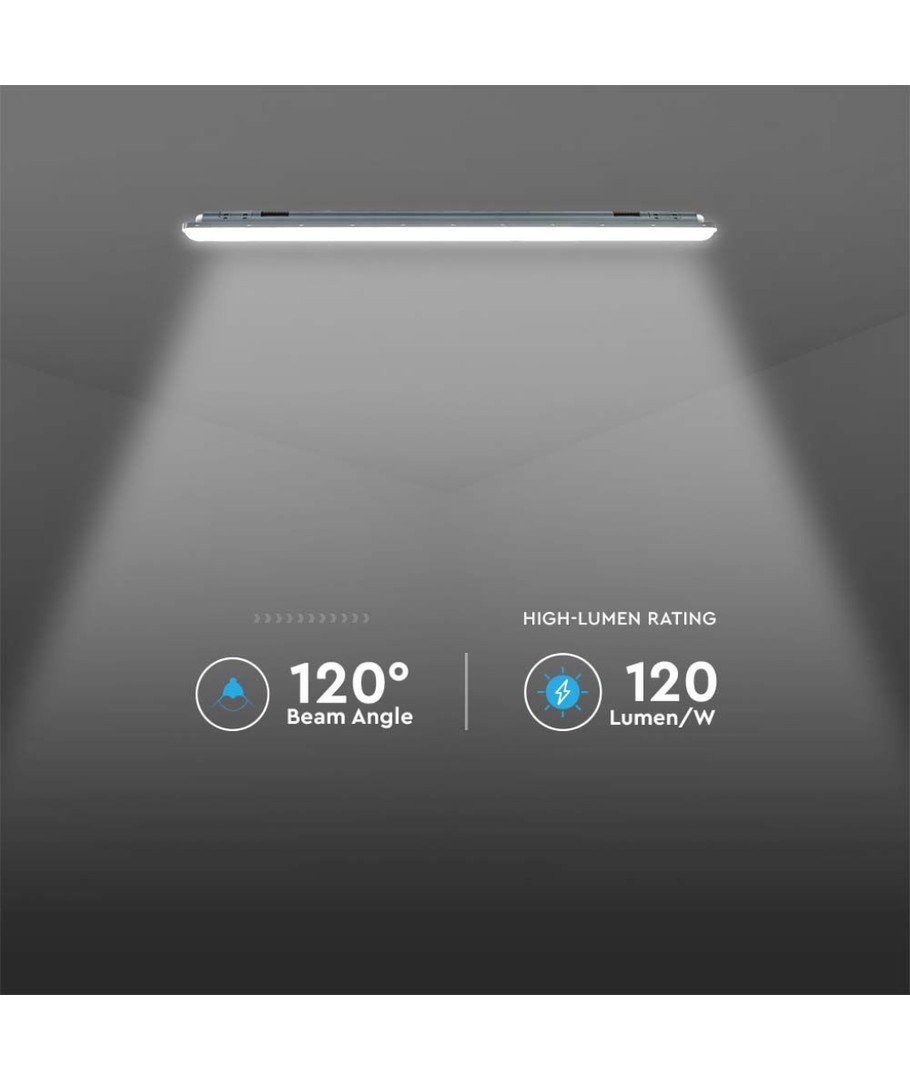 Armaturet har forskruning til kabelindføring i begge ender, for nem seriekobling. Med en IP65 rating er du sikret et robust armatur der er både vand og støvtæt. Armaturet er energivenligt med et lavt forbrug på kun 120lm/W.