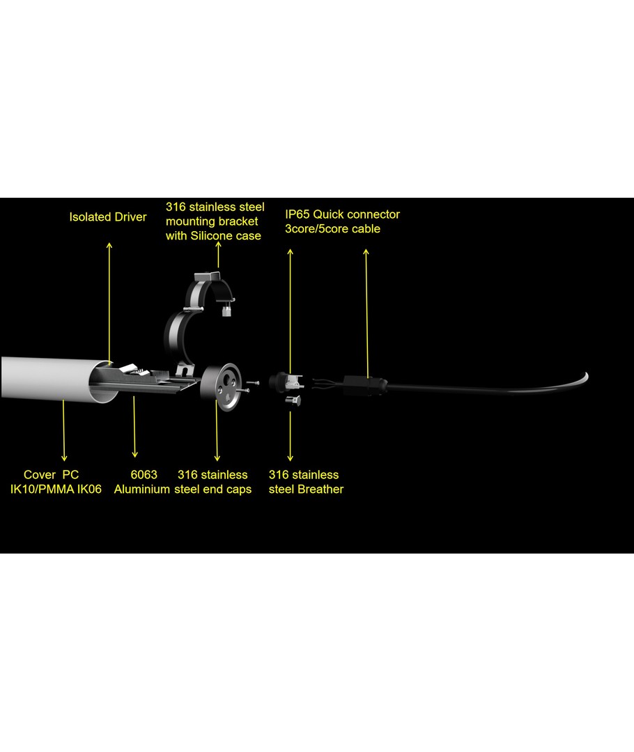 Med dimensioner på 1500 x Ø75 mm, passer dette armatur let ind i mange forskellige miljøer. Det har en IK08 vurdering for stødmodstandsdygtighed, hvilket betyder, at det kan modstå hårde forhold og stadig fungere optimalt.