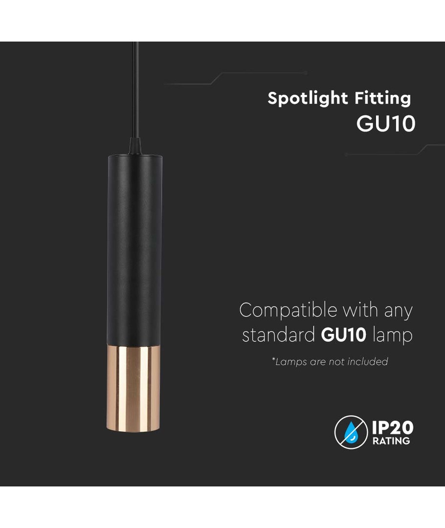 V-Tac GU10 sort/guld pendel lampe er det ideelle valg for dem, der ønsker en stilfuld og funktionel belysningsløsning.