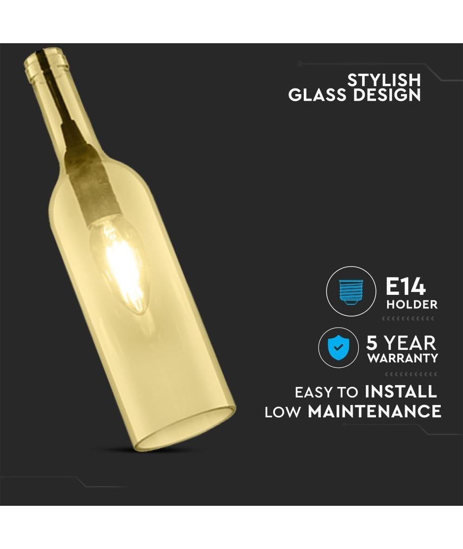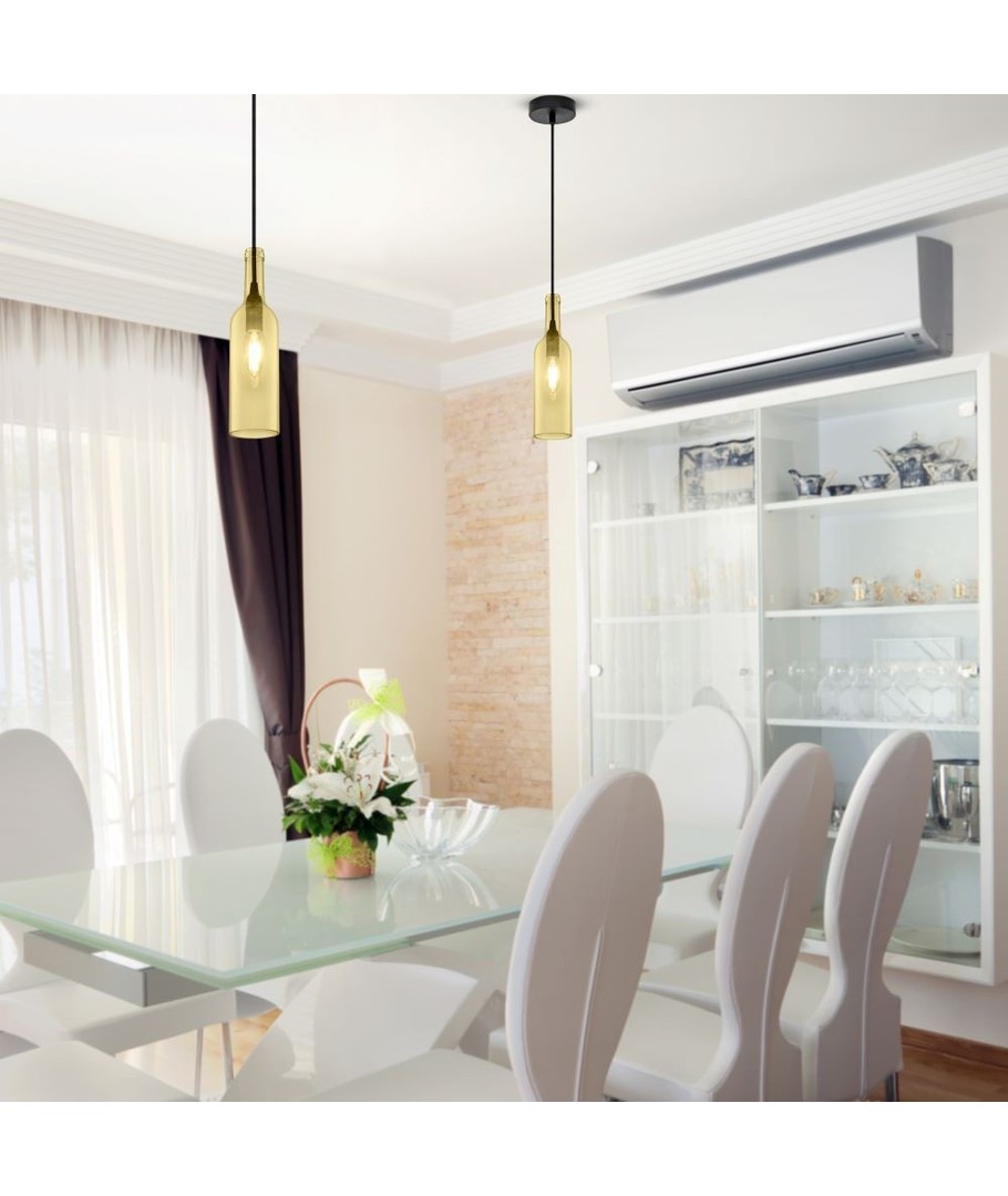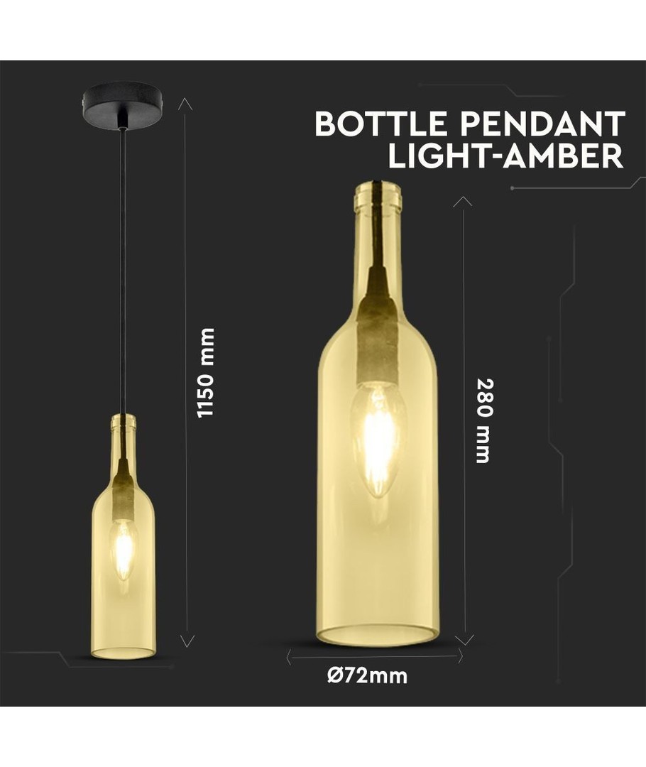 Tilføj et strejf af elegance og stil til dit hjem med denne sofistikerede flaskeformede pendellampe. Med sit unikke ravfarvede glasdesign tilbyder denne lampe en varme og charme, der kan forbedre atmosfæren i ethvert rum. Perfekt til dem, der ønsker et moderne og elegant belysningsvalg.