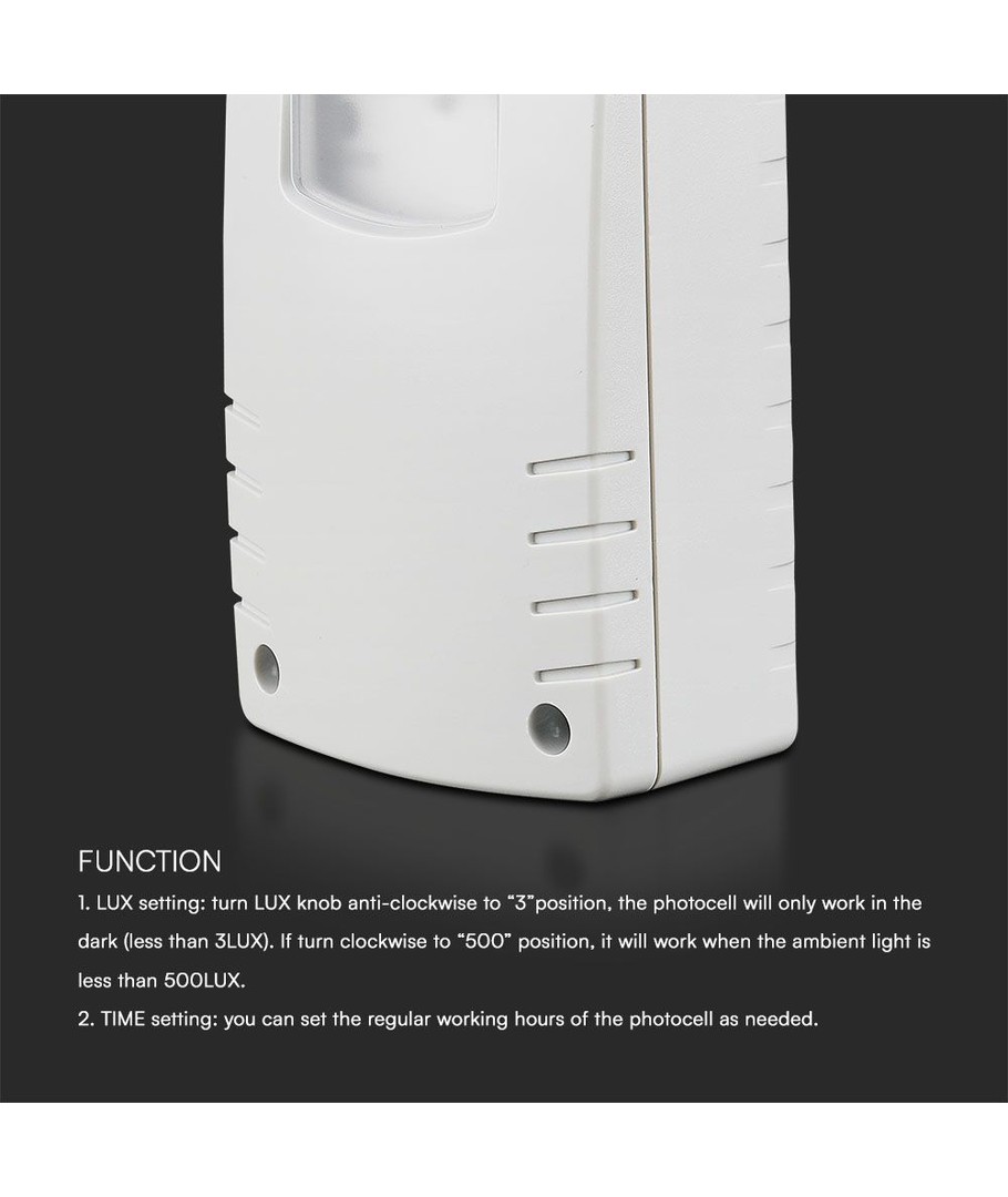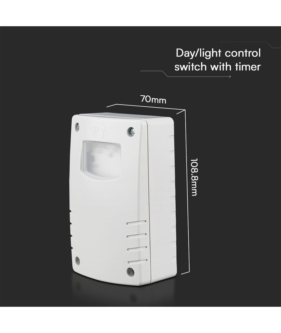 V-Tac skumringsrelæ med timer er en alsidig og effektiv løsning til dem, der ønsker automatisk belysningskontrol med mulighed for personlig tilpasning.