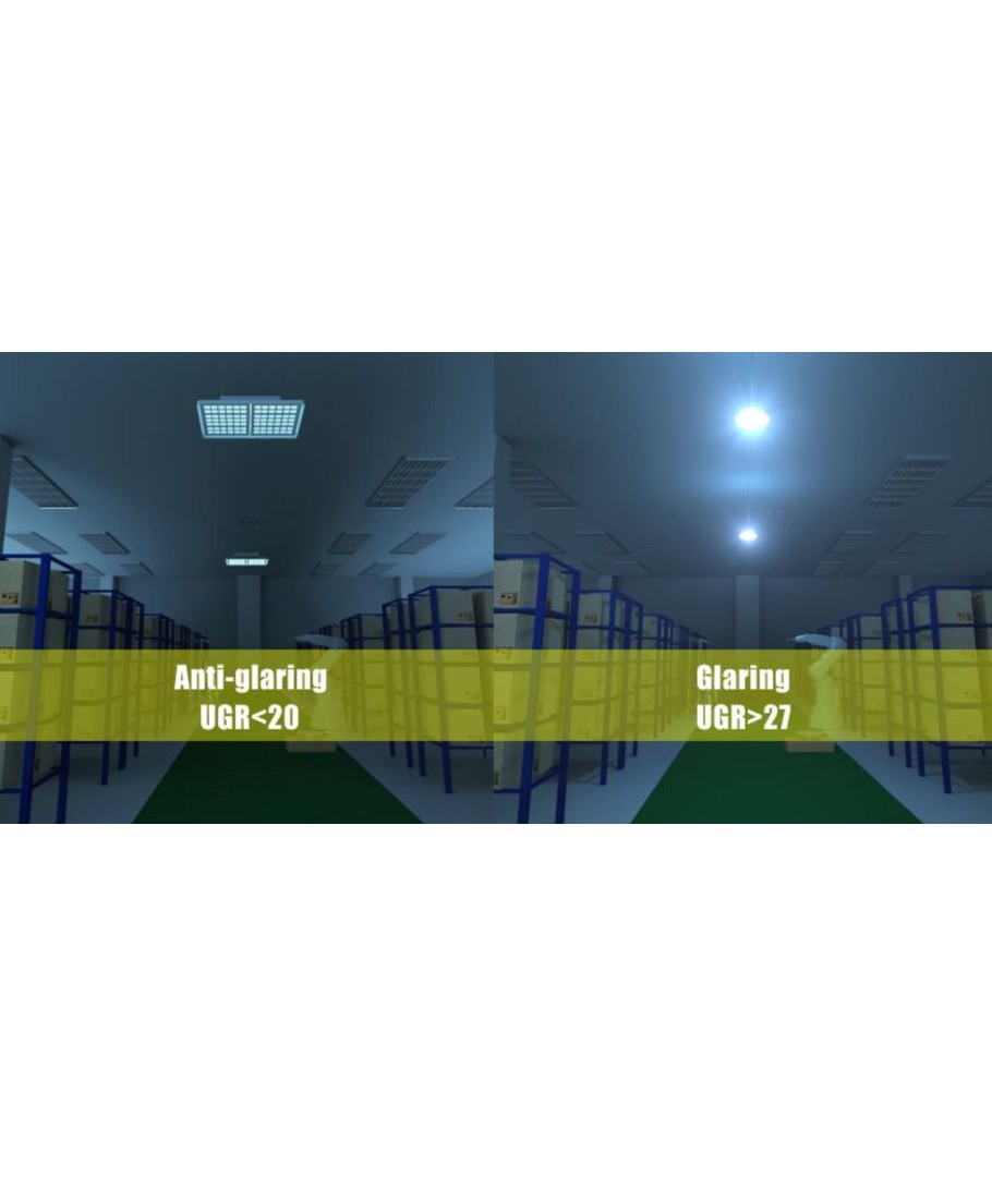 Lampen giver et kraftigt lys med højt udbytte per watt, samtidig med at den med UGR<19 ikke blænder.