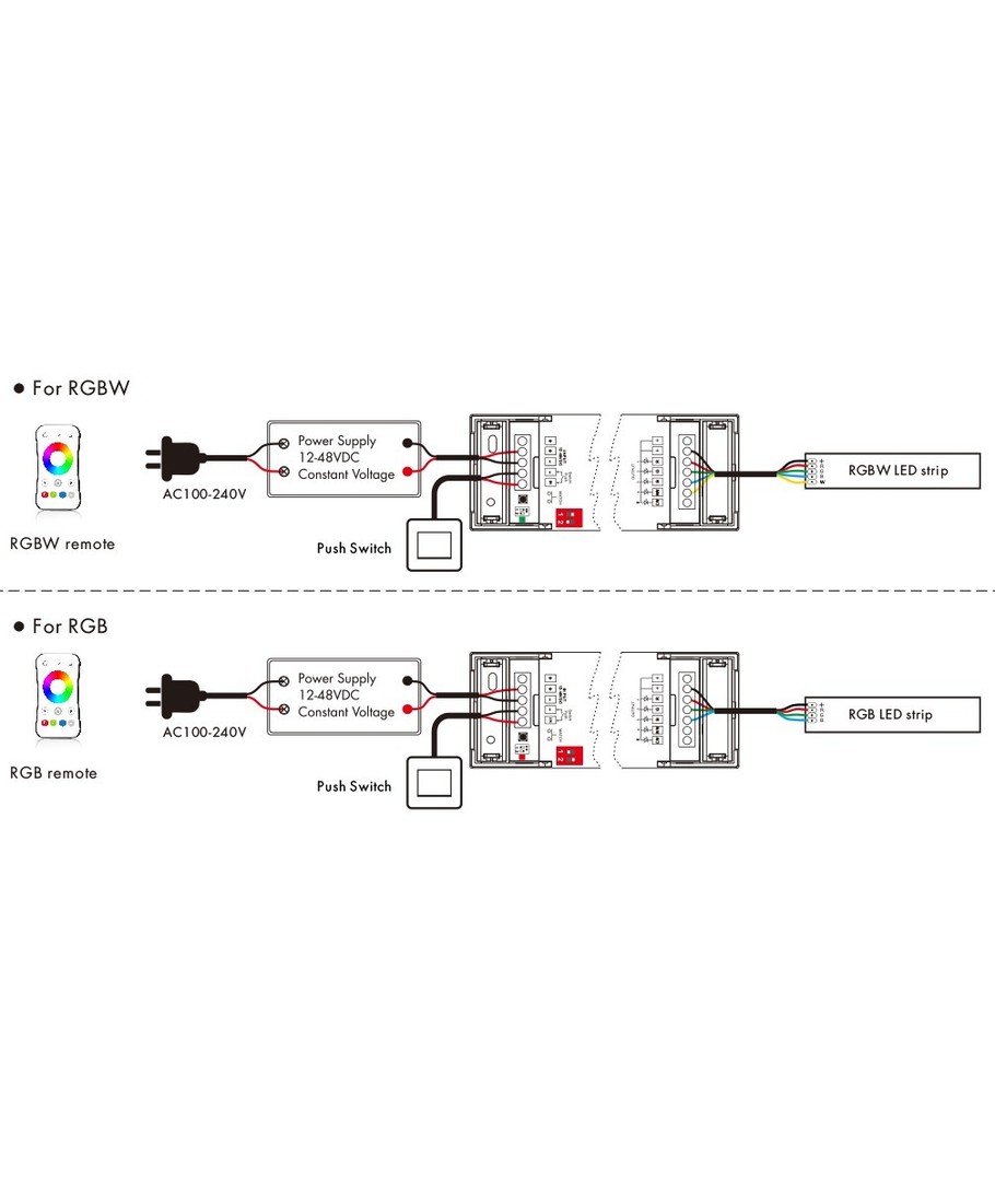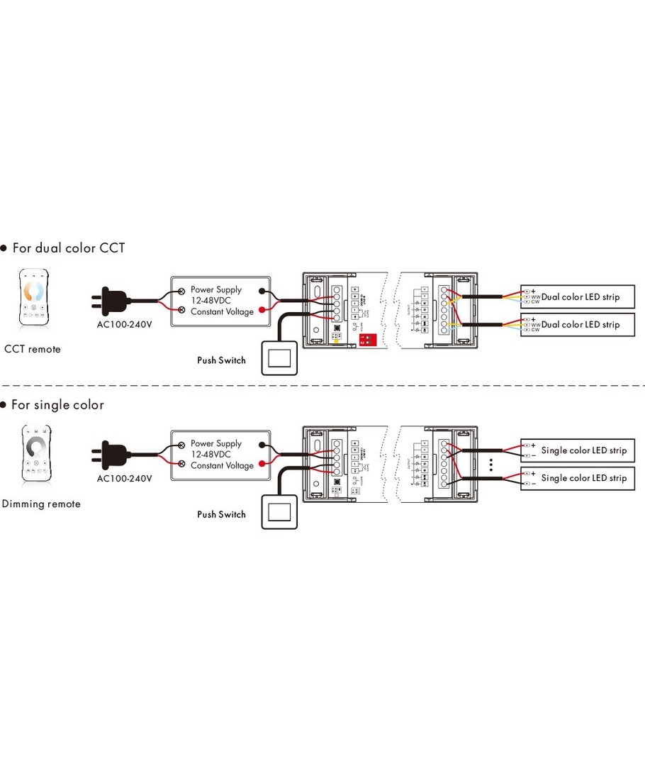 Styr 12V, 24V, 230V & dæmpning, CCT, RGB – alt med samme fjernbetjening.