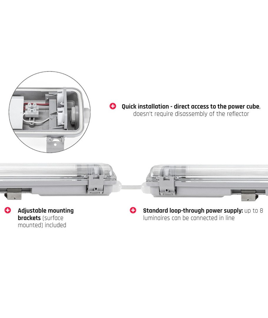 Dette armatur er det ideelle valg for dig, der søger en robust og energieffektiv belysningsløsning med en IP65 vandtæt klassificering, hvilket gør det perfekt til brug både indendørs og udendørs. Inkluderer et LED rør med en total forlængelse på 161 cm.