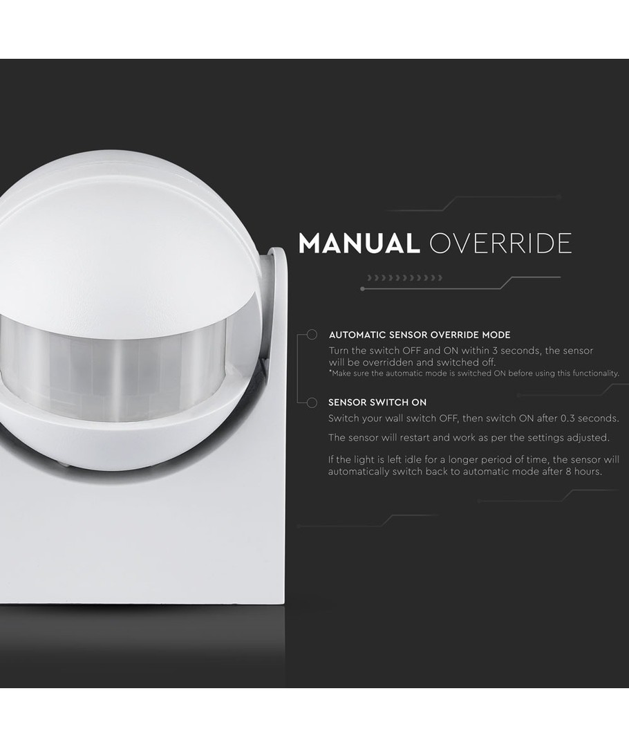 Oplev bekvemmeligheden og effektiviteten ved vores Bevægelsessensor med manuel styring - en alsidig løsning til dine belysningsbehov.