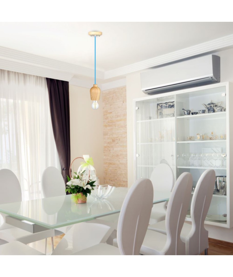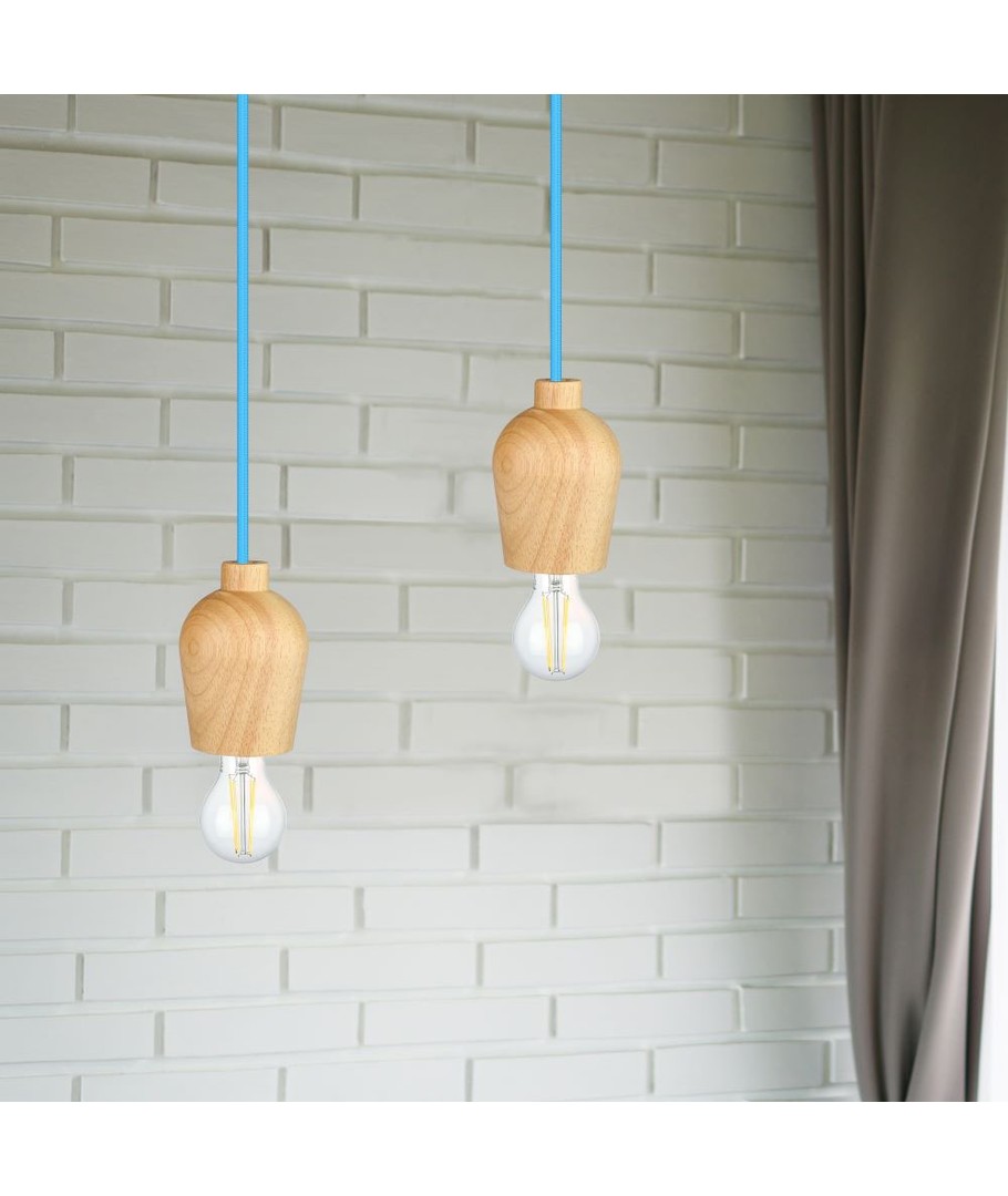 E27 Træpendel Lampe med blå ledning kombinerer naturlige materialer med moderne design.