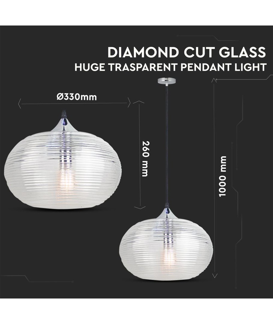 Ø35cm Diamond Cut pendel i glas - Transparent, E27 fatning, max 60W, ekskl. lyskilde V-TAC Udvid