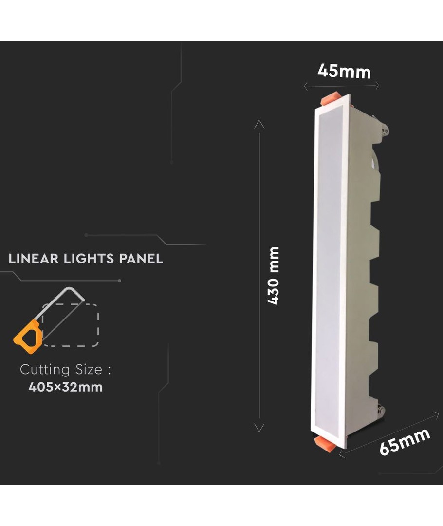 Dimensionerne på produktet er 430 x 45 x 65 mm, og det kræver en indbygningshulstørrelse på 405x32 mm. Bemærk, at dette lys har en IP20 rating, hvilket betyder, at det ikke er modstandsdygtigt over for vand.