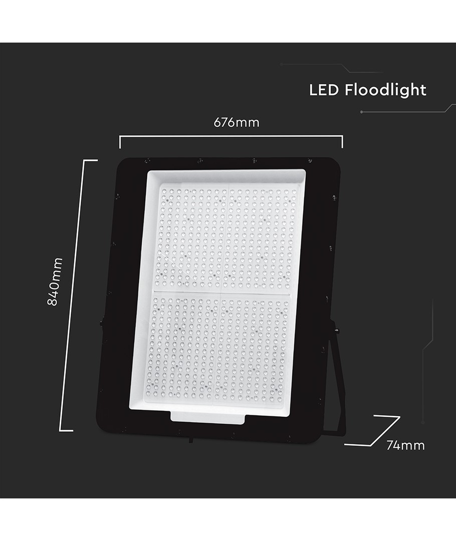 Projektøren har en robust, sort hus og sort glas, der passer diskret ind i enhver udendørs omgivelser. Med dimensionerne 840 x 74 x 676 mm, kombineret med den praktiske 1m ledning, er installationen både simpel og fleksibel.