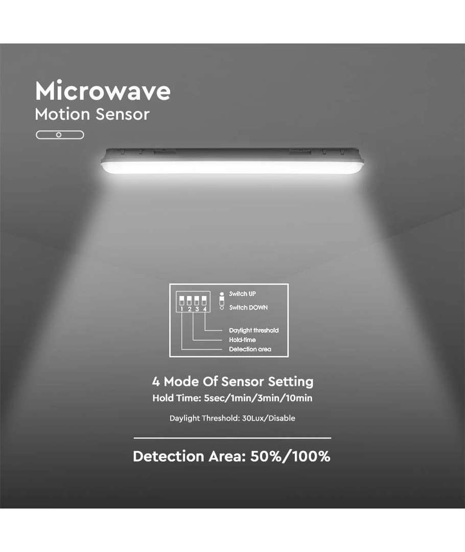 | Yderligere bemærkninger | Light-on duration: 5s, 1min, 3min, 10min. Sensor type: Microwave Sensor. Sensor distance: 50%/100%. Ambient light level: 30 Lux/Disable. |