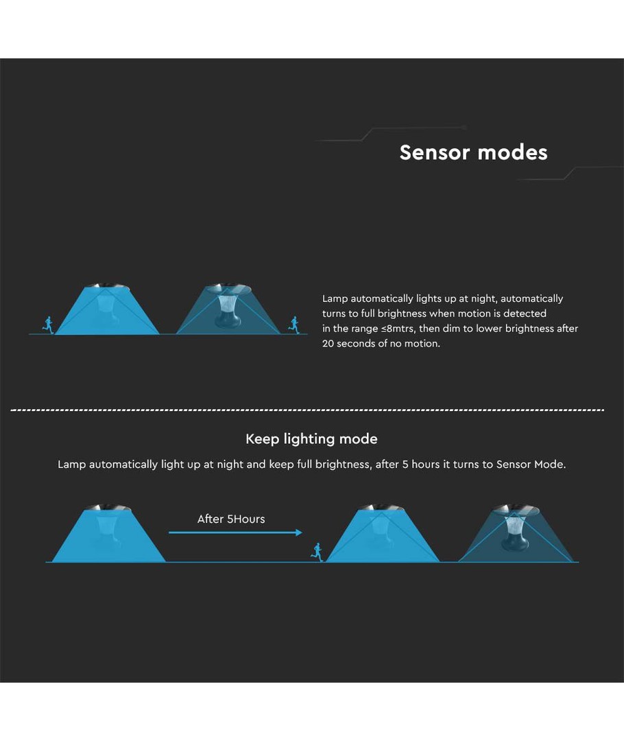 | Yderligere bemærkninger | Battery: 3.2V LifePO4 6000mAh Battery. Charging time: 7 Hours Sunlight Charging. Working time: Min 80 Hours. Sensor distance: |