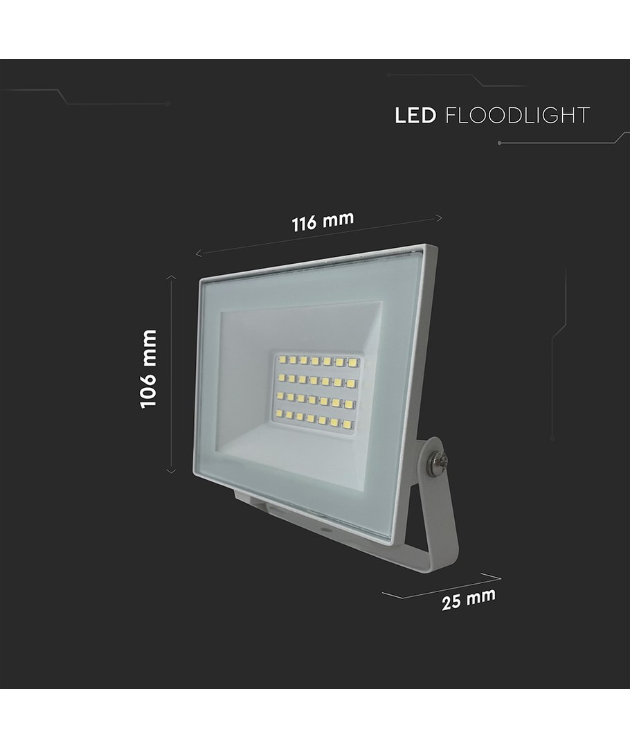 Projektørens dimensioner er 116 x 25 x 106 mm, hvilket gør den kompakt og nem at installere i forskellige miljøer. Med en IP65 beskyttelsesgrad, er den designet til at modstå vandstænk og regn, hvilket gør den velegnet til udendørs brug.