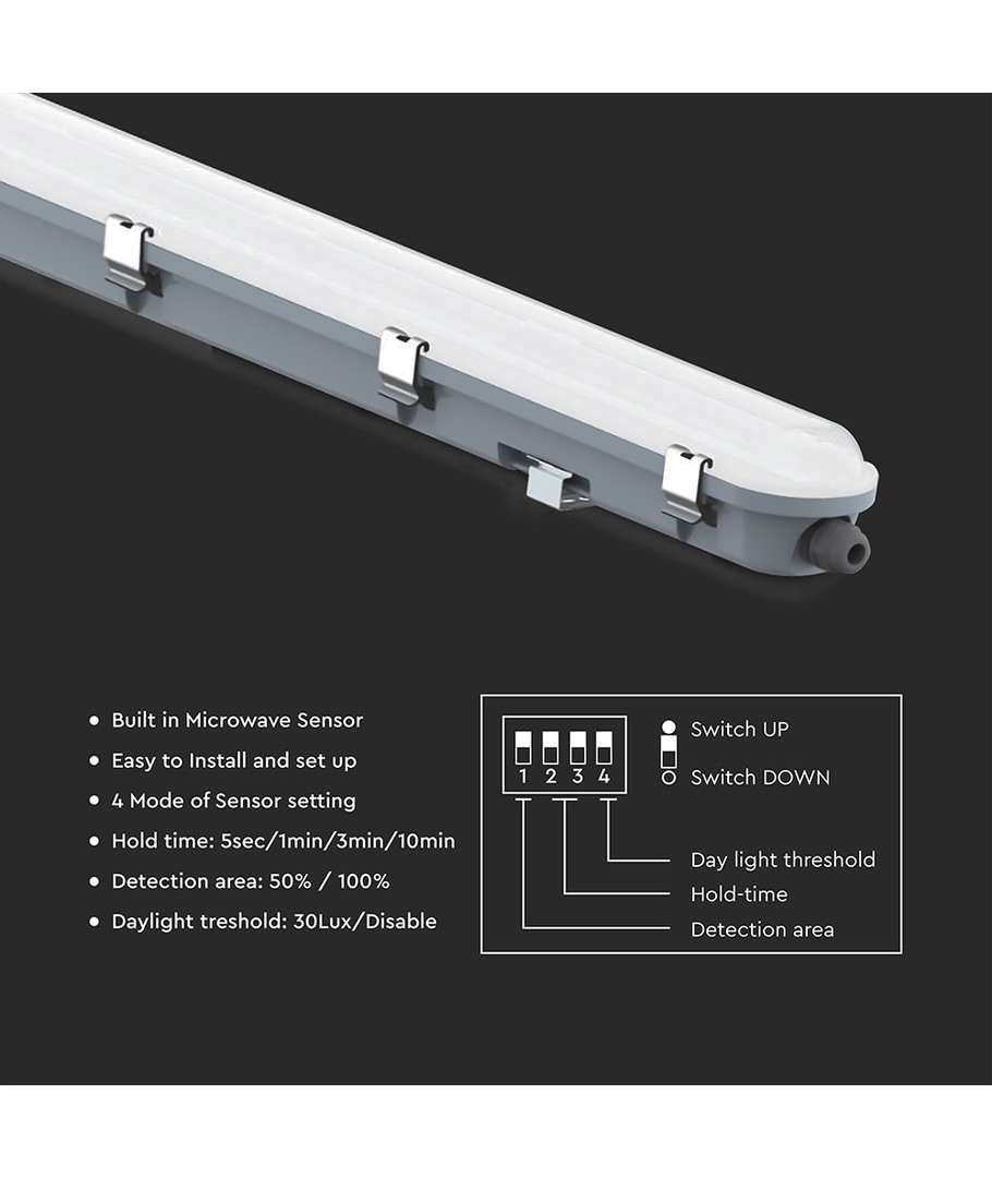 Armaturet kommer med en indbygget sensor, der gør det særligt praktisk til områder, hvor automatiseret belysning er nødvendig. Den er ideel til både indendørs og udendørs brug og er udstyret med rustfri stålclips for ekstra holdbarhed.