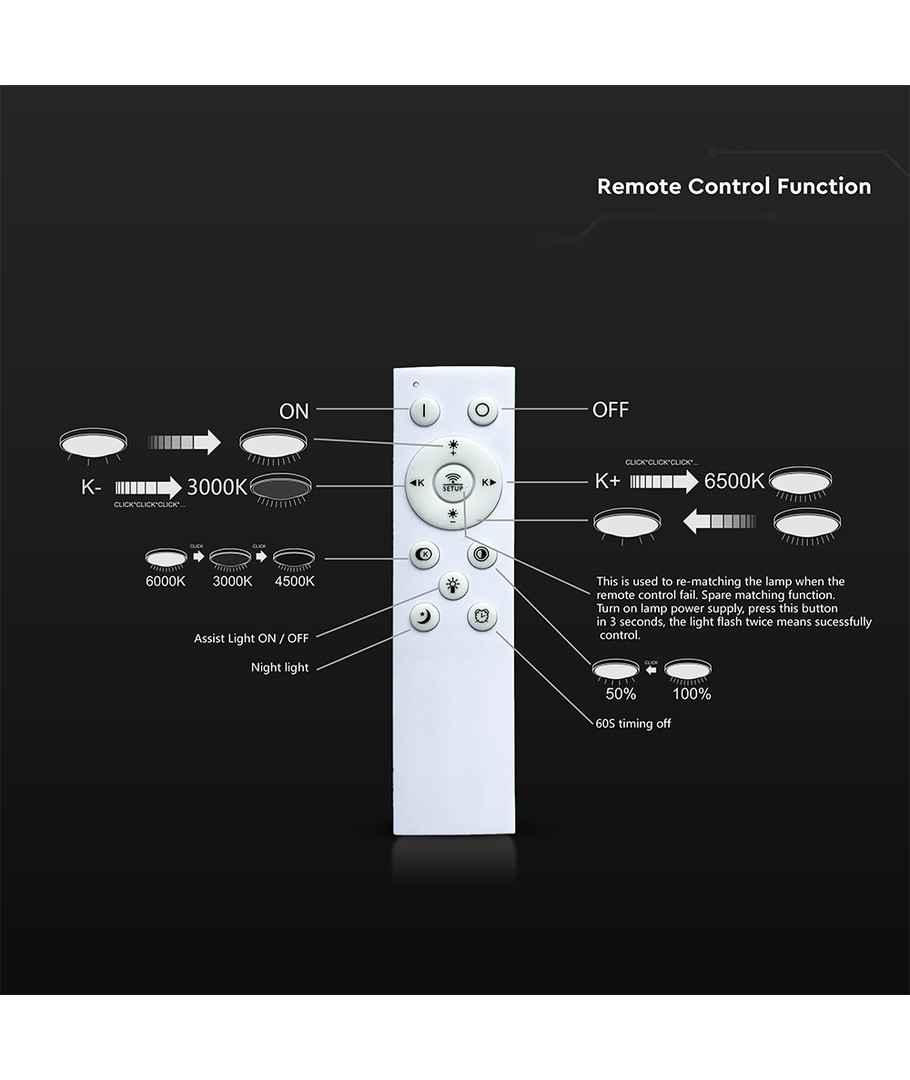 Lampen leveres med en praktisk 2.4G RF fjernbetjening, der gør det nemt at justere lysniveauet efter behov, hvilket giver ekstra fleksibilitet og komfort. Med den 3-i-1 designfunktion kan du nemt tilpasse lyset til enhver stemning eller situation.