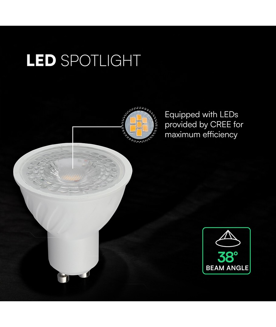 Lyskilden leverer en lysstyrke på 445 lumens og har en fokuseret lysvinkel på 38°. Med en RA-værdi på 80-85 sikrer dette spotlight, at farver vises naturligt og ægte, hvilket gør det velegnet til de fleste formål.