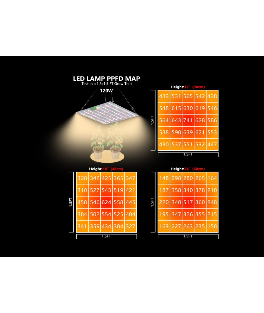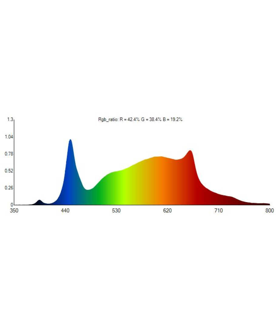 | PAR (center værdi): | 620 ppfd 30cm 580 ppfd 45cm 410 ppfd 60cm |
