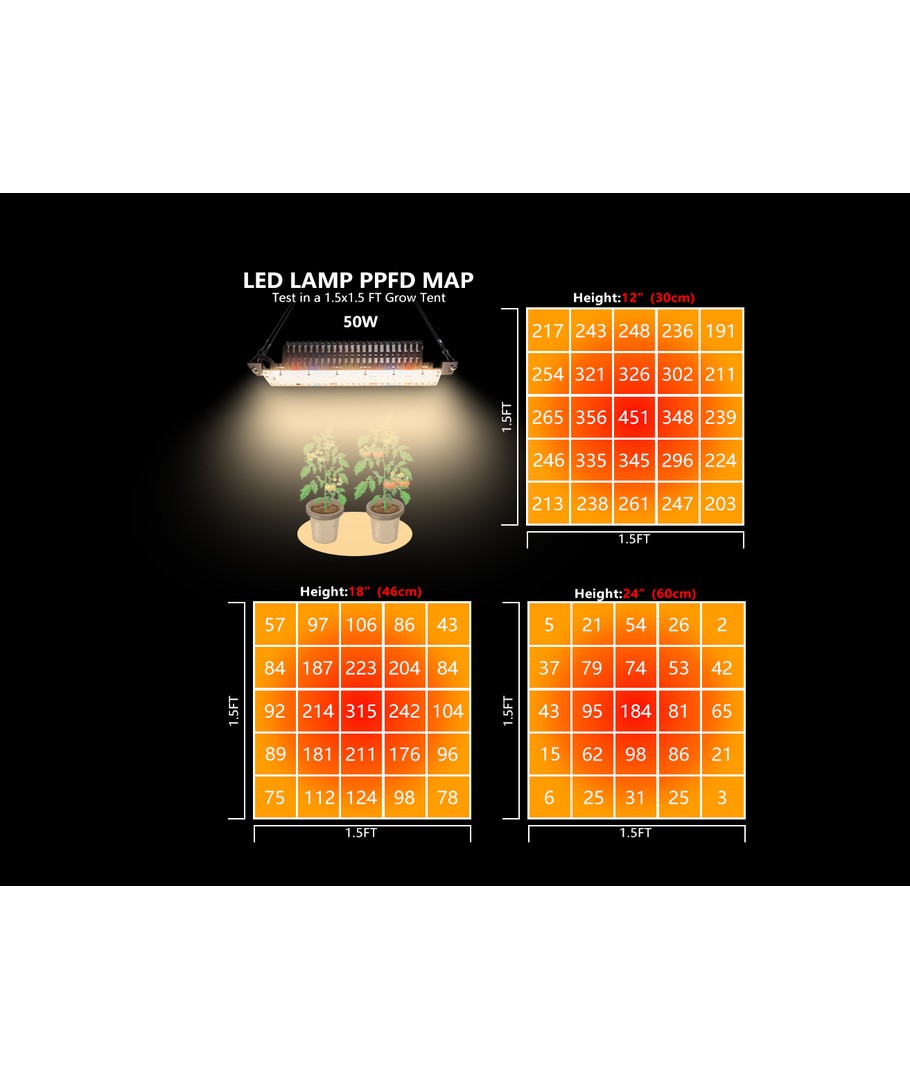 | PAR (center værdi): | 451 ppfd 30cm 315 ppfd 46cm 184 60 cm |